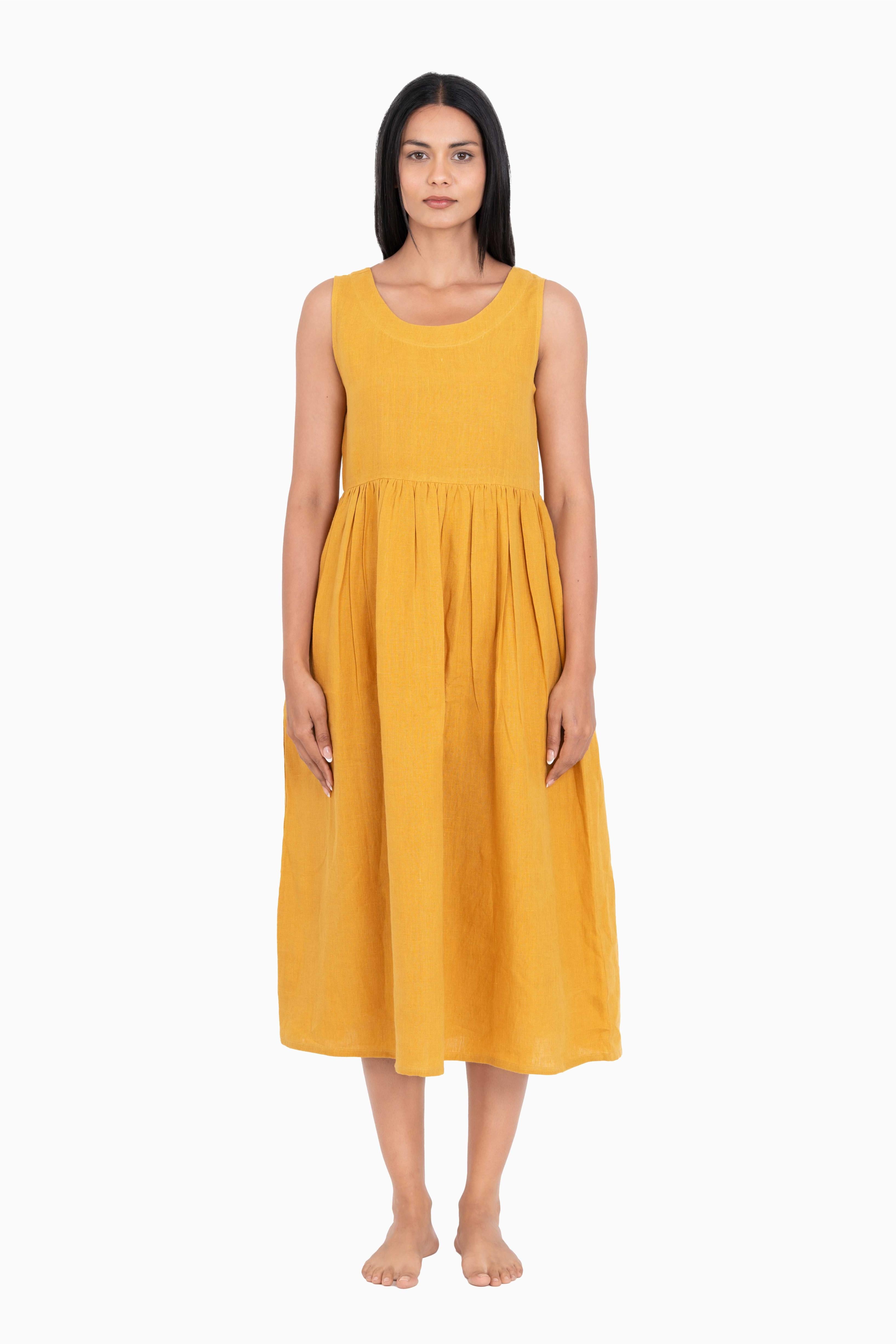 Our Linen Achill Dress is a gorgeous sleeveless dress with the round neckline. The waistline creased with subtle pleats brings volume to the entire look. This easy-to-slip dress is harmonizing and perfect for any weather. Explore our European Linen collection today!