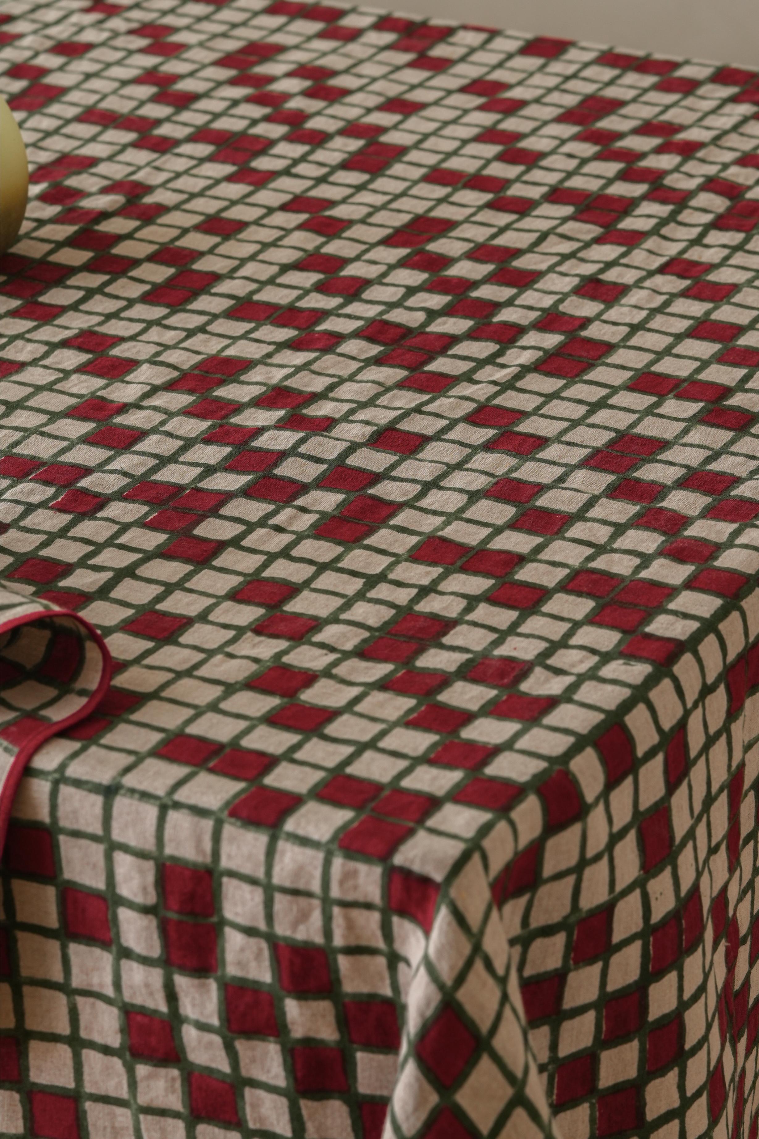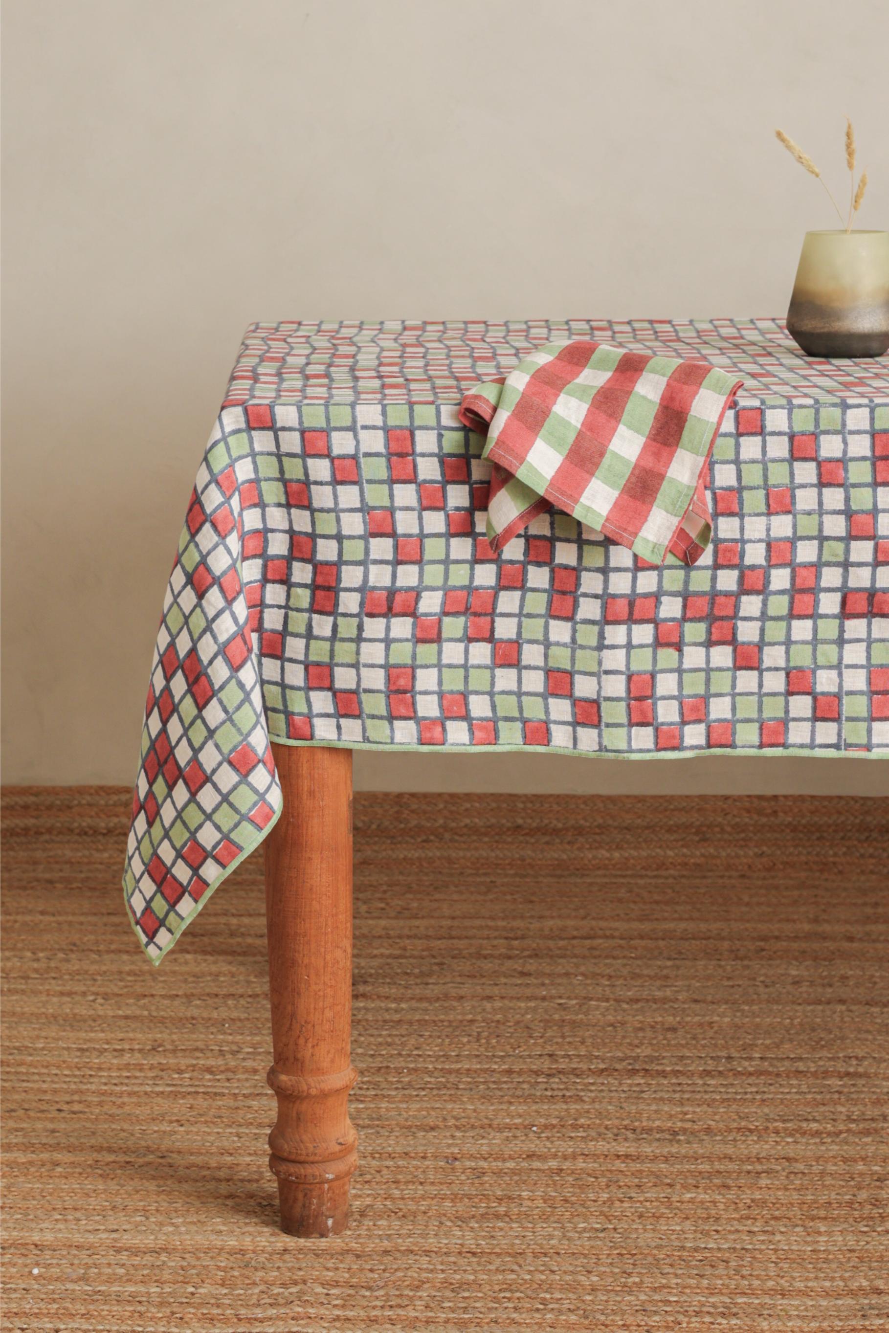 Bring artisanal charm to your table with our Linen Sudoku Tablecloth, handcrafted from 100% pure linen. The elegant green and red block-printed pattern blends traditional Indian artistry with modern geometry. Perfect for everyday dining or festive gatherings, its natural linen texture adds warmth, breathability, and timeless appeal. Pair it with brass cutlery or ceramic dinnerware for a coordinated, stylish look. Elevate your dining space with sustainable craftsmanship and the beauty of handmade linen decor.